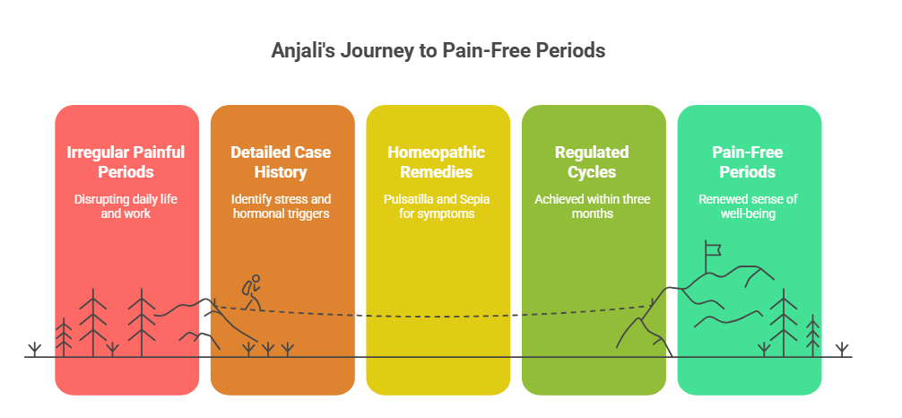 Anjali suffered from irregular and painful periods for years, impacting her daily life and work. Allopathic treatments provided temporary relief, but the pain and irregularity persisted. After consulting Dr. Parvinder Singh, a detailed case history revealed stress and hormonal imbalances as key triggers. Using advanced homeopathic remedies like Pulsatilla and Sepia, tailored to her unique symptoms, Dr. Parvinder helped regulate her cycles within three months. Today, Anjali enjoys pain-free periods and a renewed sense of well-being, crediting Dr. Parvinder’s holistic approach for her recovery.