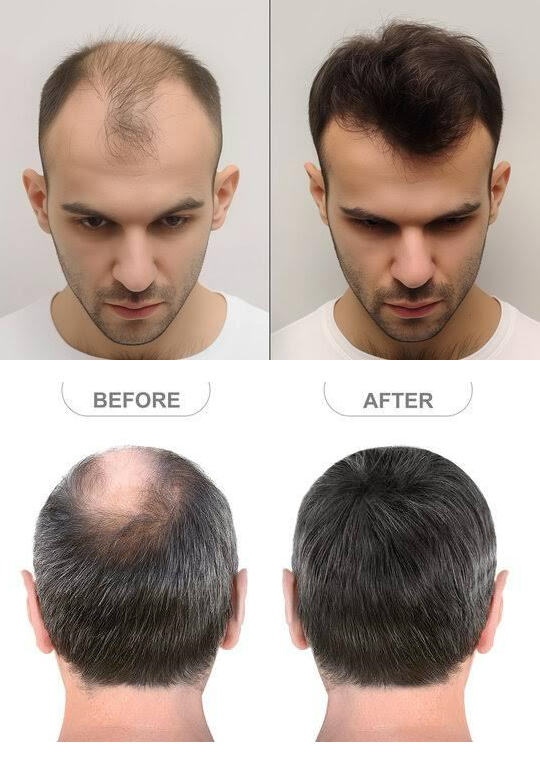 - Men: Receding hairline, thinning crown, or partial/complete baldness in advanced stages.